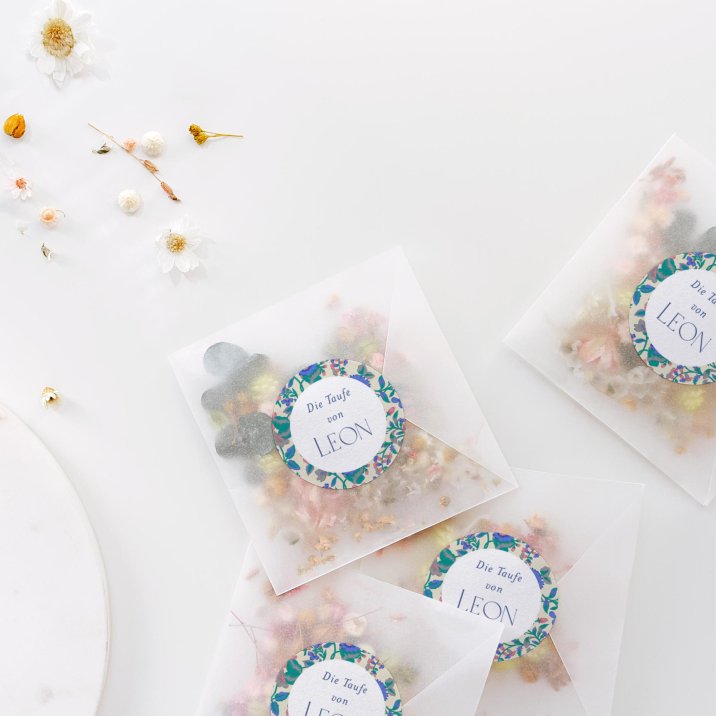 Bekleben Sie die Briefumschläge der Einladungskarten, Danksagungen oder kleine Geschenke mit unseren Stickern. Die Aufkleber lassen sich in wenigen Handgriffen mit dem Namen Ihres Kindes und dem Datum der Taufe gestalten.