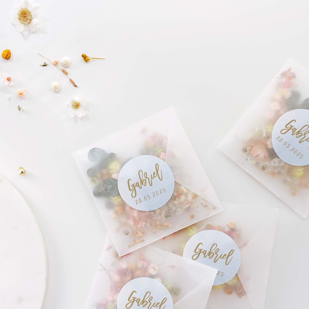 Bekleben Sie die Briefumschläge der Einladungskarten, Danksagungen oder kleine Geschenke mit unseren Stickern. Die Aufkleber lassen sich in wenigen Handgriffen mit dem Namen Ihres Kindes und dem Datum der Taufe gestalten.