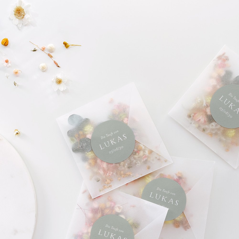 Bekleben Sie die Briefumschläge der Einladungskarten, Danksagungen oder kleine Geschenke mit unseren Stickern. Die Aufkleber lassen sich in wenigen Handgriffen mit dem Namen Ihres Kindes und dem Datum der Taufe gestalten.