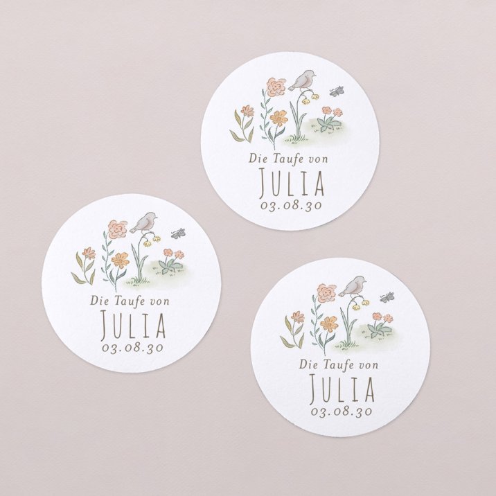 Runden Sie Ihre Papeterie und Deko mit den passenden Aufklebern ab. Mit dem Namen des Taufkindes und einer persönlichen Notiz gestaltet, können Sie mit den großen runden Aufklebern die verschiedensten Artikel schmücken: Briefumschläge, Geschenke, Marmeladengläser, Kerzen, und vieles mehr...!