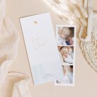 Diese Danksagung hat es in sich: die Klappkarte im Hochformat beinhaltet einen Fotostreifen mit Platz für 3 Ihrer schönsten Fotos von der Taufe. Der Streifen kann als Andenken in der Karte aufbewahrt werden, aber auch herausgenommen und an den Kühlschrank gepinnt oder als Lesezeichen genutzt werden.