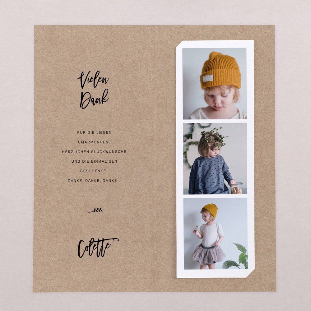 Diese Danksagung hat es in sich: die Klappkarte im Hochformat beinhaltet einen Fotostreifen mit Platz für 3 Ihrer schönsten Fotos von der Taufe. Der Streifen kann als Andenken in der Karte aufbewahrt werden, aber auch herausgenommen und an den Kühlschrank gepinnt oder als Lesezeichen genutzt werden.