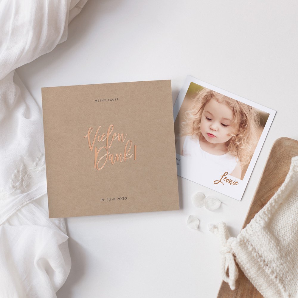 Bedanken Sie sich bei Ihren Lieben, die Sie anlässlich der Taufe Ihres Kindes mit Aufmerksamkeiten verwöhnt haben, mit einer hübschen, persönlichen Karte.