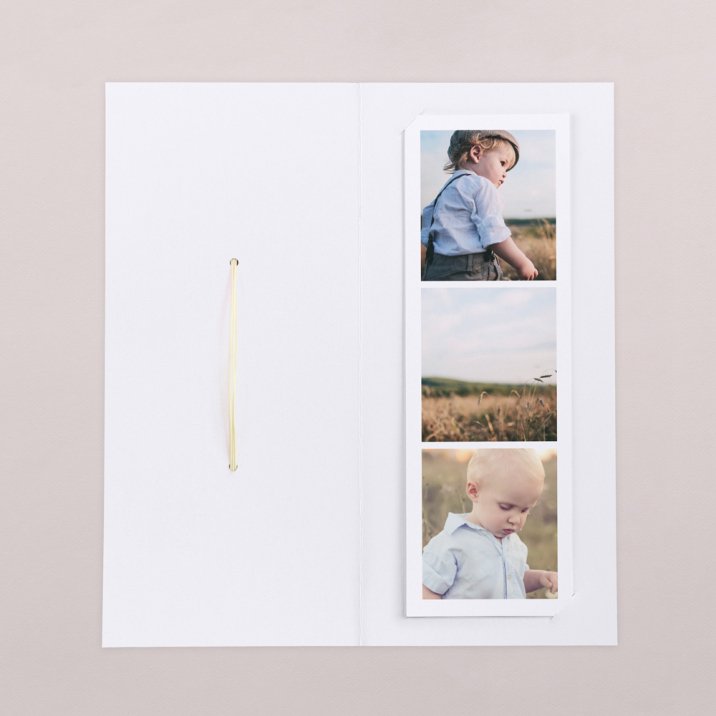 Diese Danksagung hat es in sich: die Klappkarte im Hochformat mit wunderschönen Trockenblumen beinhaltet einen Fotostreifen mit Platz für 3 Ihrer schönsten Fotos. Der Streifen kann als Andenken an die Taufe aufbewahrt werden, an den Kühlschrank gepinnt oder als Lesezeichen genutzt werden.