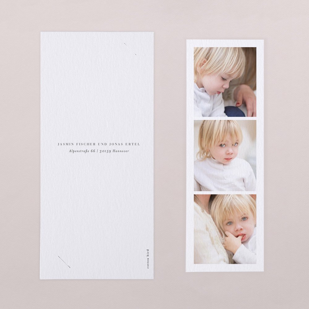 Diese Danksagung hat es in sich: die Klappkarte im Hochformat mit wunderschönen Trockenblumen beinhaltet einen Fotostreifen mit Platz für 3 Ihrer schönsten Fotos. Der Streifen kann als Andenken an die Taufe aufbewahrt werden, an den Kühlschrank gepinnt oder als Lesezeichen genutzt werden.
