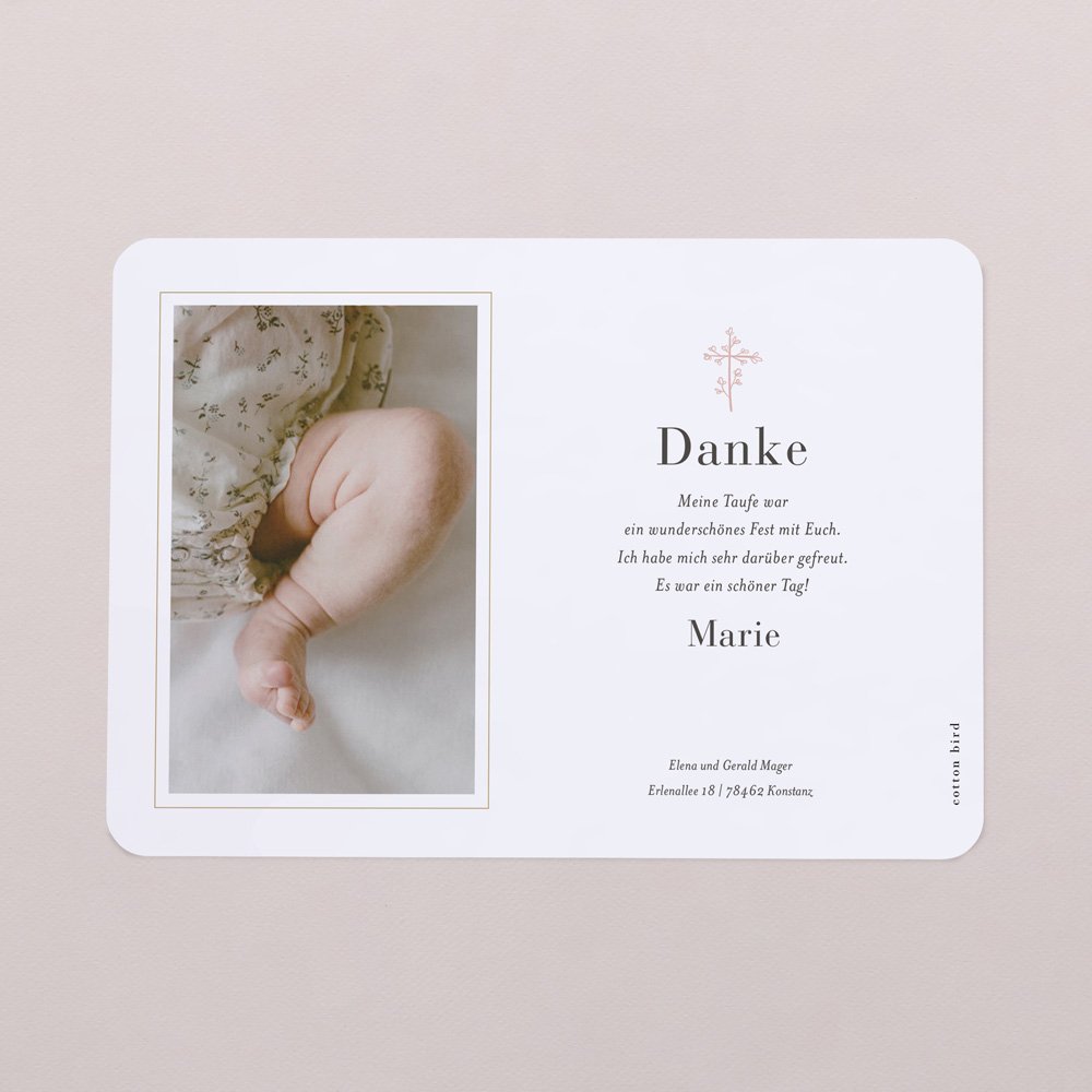 Gestalten Sie die Danksagung mit abgerundeten Ecken mit Ihren ganz persönlichen Dankesworten und einem schönen Foto vom Taufkind.