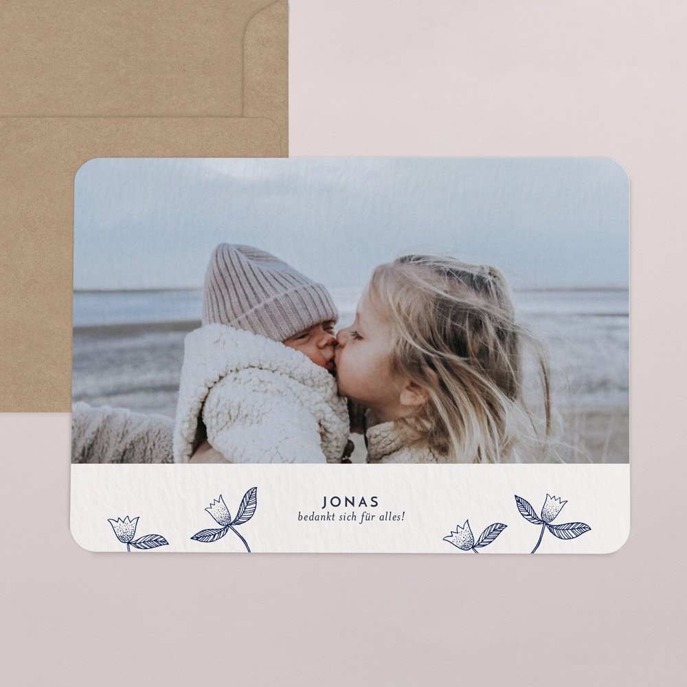 Gestalten Sie die Danksagung mit abgerundeten Ecken mit Ihren ganz persönlichen Dankesworten und einem schönen Foto vom Taufkind.