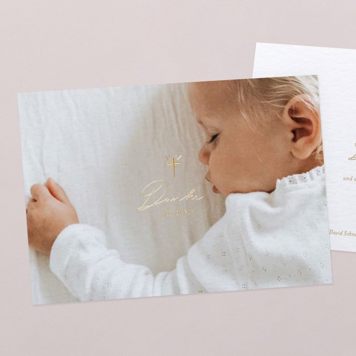 Wählen Sie Ihre Danksagung passend zu Ihrer Taufeinladung und gestalten Sie die Karte mit einem hübschen Foto und herzlichen Dankesworten, um so auf stilvolle Art und Weise "Danke" zu sagen.