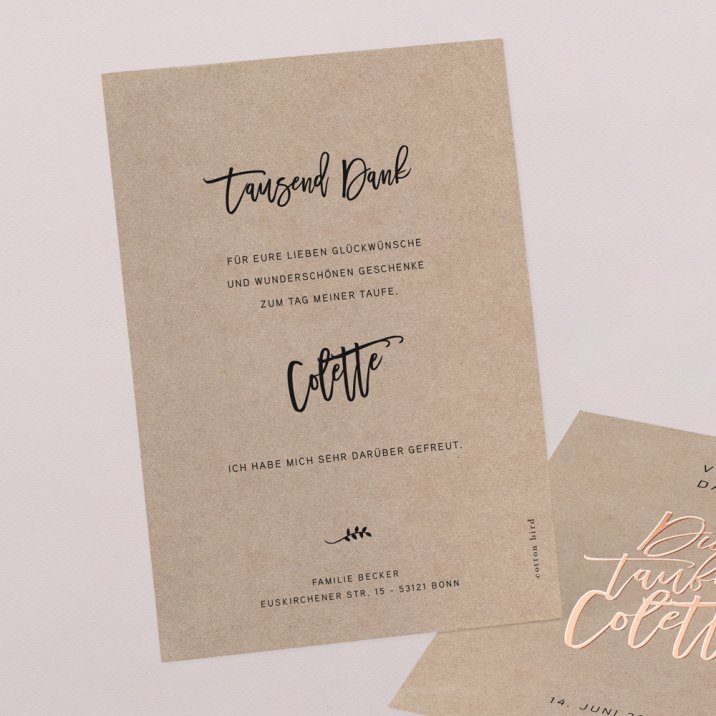 Wählen Sie Ihre Danksagung passend zu Ihrer Taufeinladung und gestalten Sie die Karte mit einem hübschen Foto und herzlichen Dankesworten, um so auf stilvolle Art und Weise "Danke" zu sagen.