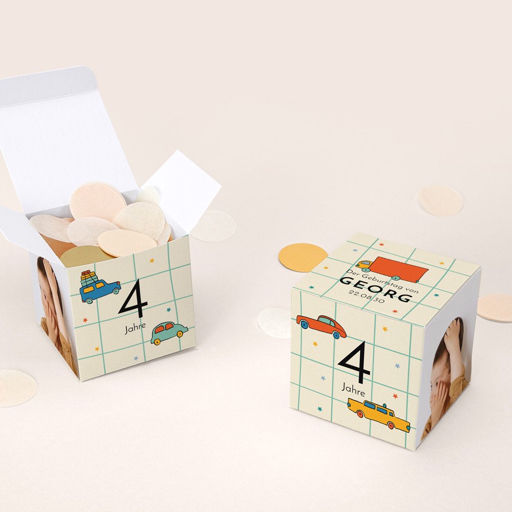 Süßigkeiten, Kekse, Gummibärchen oder kleine Spielzeuge ? Lassen Sie Ihrer Phantasie freien Lauf und füllen Sie die Geschenkbox mit einer kleinen Überraschung für Ihre Geburtstagsgäste. Die Box kann mit dem Namen Ihres Kindes und anderen Informationen (Datum, Alter, usw.) sowie einer kleinen Nachricht personalisiert werden.