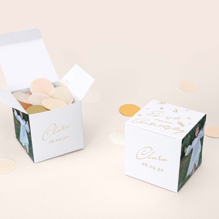 Süßigkeiten, Kekse, Gummibärchen oder kleine Spielzeuge ? Lassen Sie Ihrer Phantasie freien Lauf und füllen Sie die Geschenkbox mit einer kleinen Überraschung für Ihre Geburtstagsgäste. Die Box kann mit dem Namen Ihres Kindes und anderen Informationen (Datum, Alter, usw.) sowie einer kleinen Nachricht personalisiert werden.