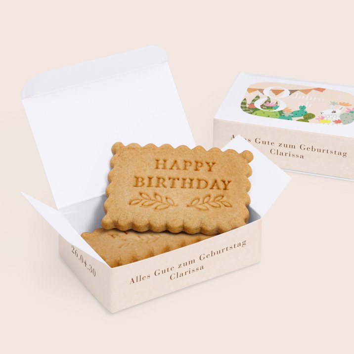 Überraschen Sie die Geburtstagsgäste als kleines Dankeschön mit ein paar selbst gebackenen Keksen in einer schönen Keksbox! Personalisieren Sie die Keksbox mit dem Namen Ihres Kindes, dem Geburtstag, Datum und ein paar Dankesworten. Die lecker gefüllte Keksbox ist ein schönes Andenken, dass die Geburtstagsgäste sicher gerne mit nach Hause nehmen.