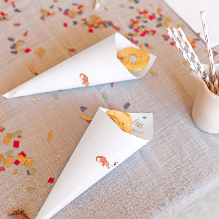 Luftschlangen, Knallerbsen, Konfetti ? und alles was zum Kindergeburtstag Spaß macht kann in die Spitztüten gefüllt werden. Buntstifte zum Malen oder Süßigkeiten (Popcorn, Gummibärchen usw.) sind weitere Ideen, um den Geburtstagsgästen eine Freude zu bereiten.