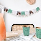 Diese Girlande mit 16 doppelseitigen Wimpeln, passend zur Geburtstagseinladung, kann mit dem Namen Ihres Kindes, dem Geburtstag, einem Foto und einem Glückwunsch personalisiert werden. Außerdem können Sie eine passende Schnur in naturfarben oder weiß/gold wählen.