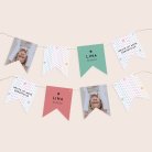 Diese Girlande mit 16 doppelseitigen Wimpeln, passend zur Geburtstagseinladung, kann mit dem Namen Ihres Kindes, dem Geburtstag, einem Foto und einem Glückwunsch personalisiert werden. Außerdem können Sie eine passende Schnur in naturfarben oder weiß/gold wählen.