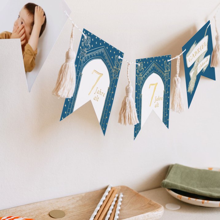Diese Girlande mit 16 doppelseitigen Wimpeln, passend zur Geburtstagseinladung, kann mit dem Namen Ihres Kindes, dem Geburtstag, einem Foto und einem Glückwunsch personalisiert werden. Außerdem können Sie eine passende Schnur in naturfarben oder weiß/gold wählen.