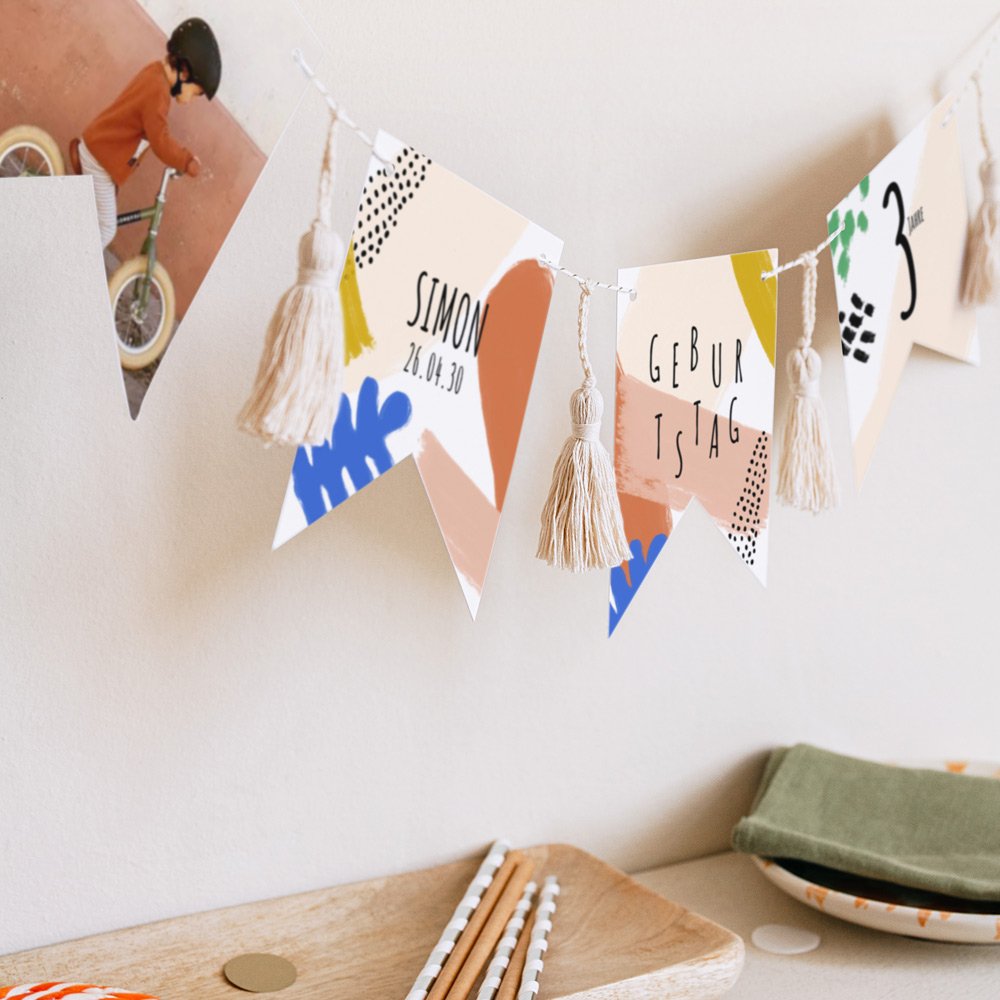 Diese Girlande mit 16 doppelseitigen Wimpeln, passend zur Geburtstagseinladung, kann mit dem Namen Ihres Kindes, dem Geburtstag, einem Foto und einem Glückwunsch personalisiert werden. Außerdem können Sie eine passende Schnur in naturfarben oder weiß/gold wählen.Wir empfehlen Ihnen, die Girlande zusätzlich mit hübschen Quasten in Creme oder Hellrosa zu dekorieren (Set mit 15 Quasten als Zusatzoption bestellbar).