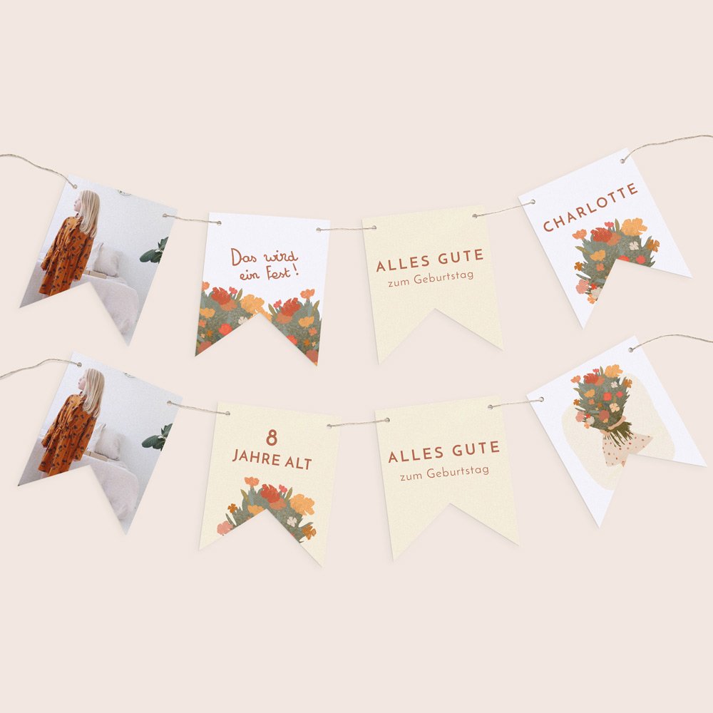 Diese Girlande mit 16 doppelseitigen Wimpeln, passend zur Geburtstagseinladung, kann mit dem Namen Ihres Kindes, dem Geburtstag, einem Foto und einem Glückwunsch personalisiert werden. Außerdem können Sie eine passende Schnur in naturfarben oder weiß/gold wählen.Wir empfehlen Ihnen, die Girlande zusätzlich mit hübschen Quasten in Creme oder Hellrosa zu dekorieren (Set mit 15 Quasten als Zusatzoption bestellbar).
