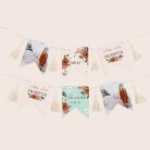 Diese Girlande mit 16 doppelseitigen Wimpeln, passend zur Geburtstagseinladung, kann mit dem Namen Ihres Kindes, dem Geburtstag, einem Foto und einem Glückwunsch personalisiert werden. Außerdem können Sie eine passende Schnur in naturfarben oder weiß/gold wählen.Wir empfehlen Ihnen, die Girlande zusätzlich mit hübschen Quasten in Creme oder Hellrosa zu dekorieren (Set mit 15 Quasten als Zusatzoption bestellbar).