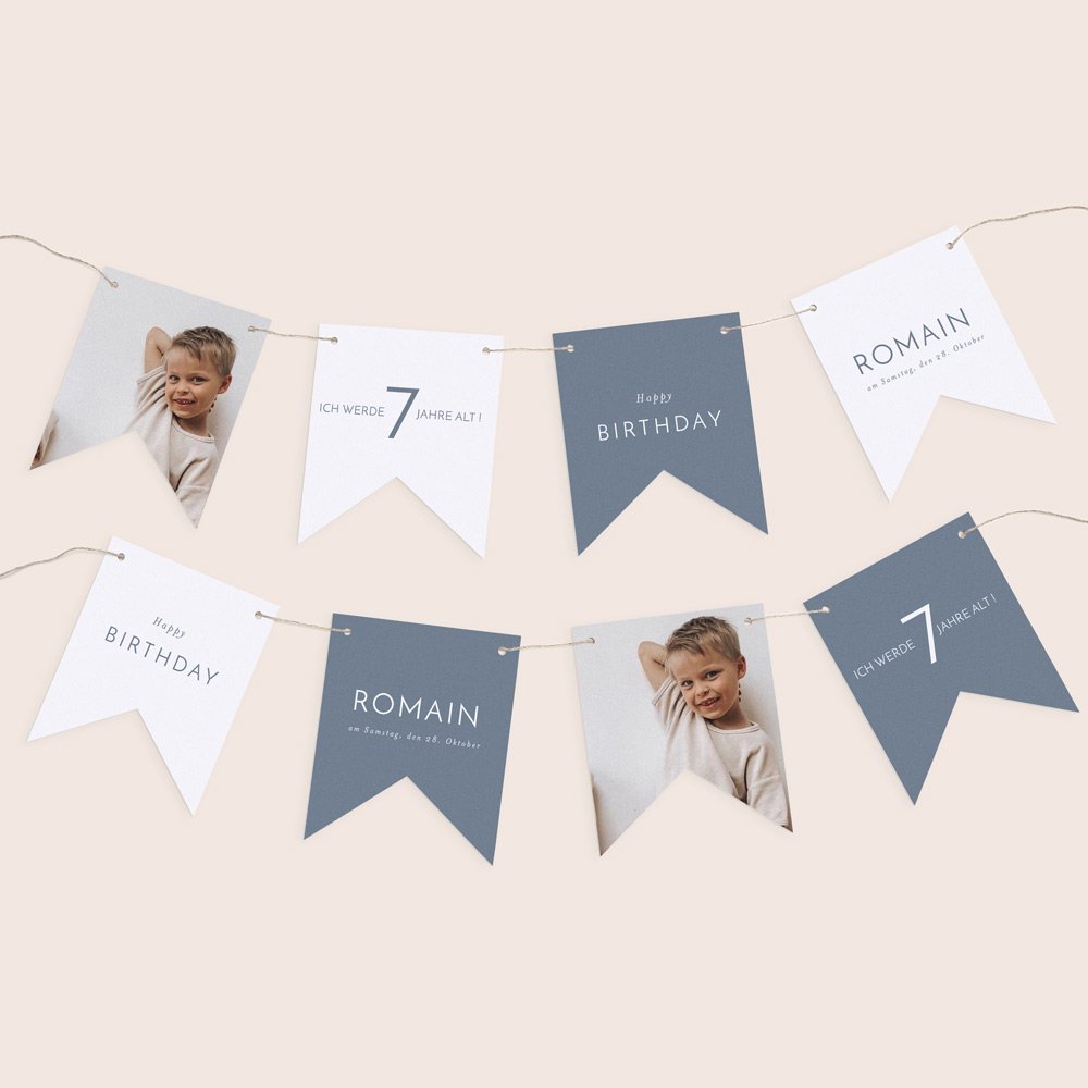 Diese Girlande mit 16 doppelseitigen Wimpeln, passend zur Geburtstagseinladung, kann mit dem Namen Ihres Kindes, dem Geburtstag, einem Foto und einem Glückwunsch personalisiert werden. Außerdem können Sie eine passende Schnur in naturfarben oder weiß/gold wählen.Wir empfehlen Ihnen, die Girlande zusätzlich mit hübschen Quasten in Creme oder Hellrosa zu dekorieren (Set mit 15 Quasten als Zusatzoption bestellbar).