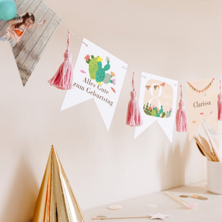 Zaubern Sie gute Stimmung zum Geburtstag Ihres Kindes, indem Sie den Ort der Feier mit der süßen Girlande Kaktus dekorieren.