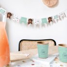 Diese Girlande mit 16 doppelseitigen Wimpeln, passend zur Geburtstagseinladung, kann mit dem Namen Ihres Kindes, dem Geburtstag, einem Foto und einem Glückwunsch personalisiert werden. Außerdem können Sie eine passende Schnur in naturfarben oder weiß/gold wählen.Wir empfehlen Ihnen, die Girlande zusätzlich mit hübschen Quasten in Creme oder Hellrosa zu dekorieren (Set mit 15 Quasten als Zusatzoption bestellbar).