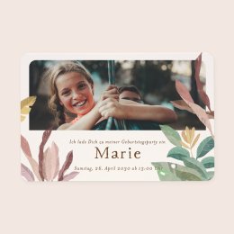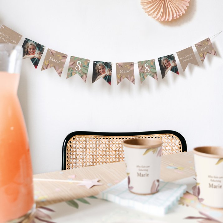 Diese Girlande mit 16 doppelseitigen Wimpeln, passend zur Geburtstagseinladung, kann mit dem Namen Ihres Kindes, dem Geburtstag, einem Foto und einem Glückwunsch personalisiert werden. Außerdem können Sie eine passende Schnur in naturfarben oder weiß/gold wählen.Wir empfehlen Ihnen, die Girlande zusätzlich mit hübschen Quasten in Creme oder Hellrosa zu dekorieren (Set mit 15 Quasten als Zusatzoption bestellbar).