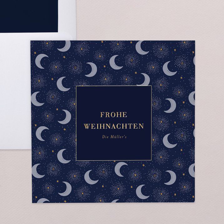 Funkel, funkel, kleiner Stern... tiefblauer Nachthimmel mit glänzenden Sternen und Monden in Gold Überbringen Ihre Weihnachtsgrüße auf poetische Weise! Die trendige Weihnachtskarte Heilige Nacht II wird die Empfänger Ihrer Weihnachtspost erfreuen.