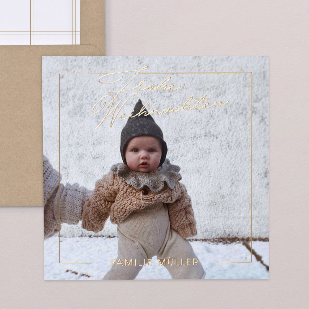 Auf der Karte Goldrahmen veredeln grafische Linien und goldene Typografie Ihr Foto. Das minimalistische und elegante Design verleiht Ihren Weihnachtsgrüßen für Familie und Freunde einen sanften Zauber.