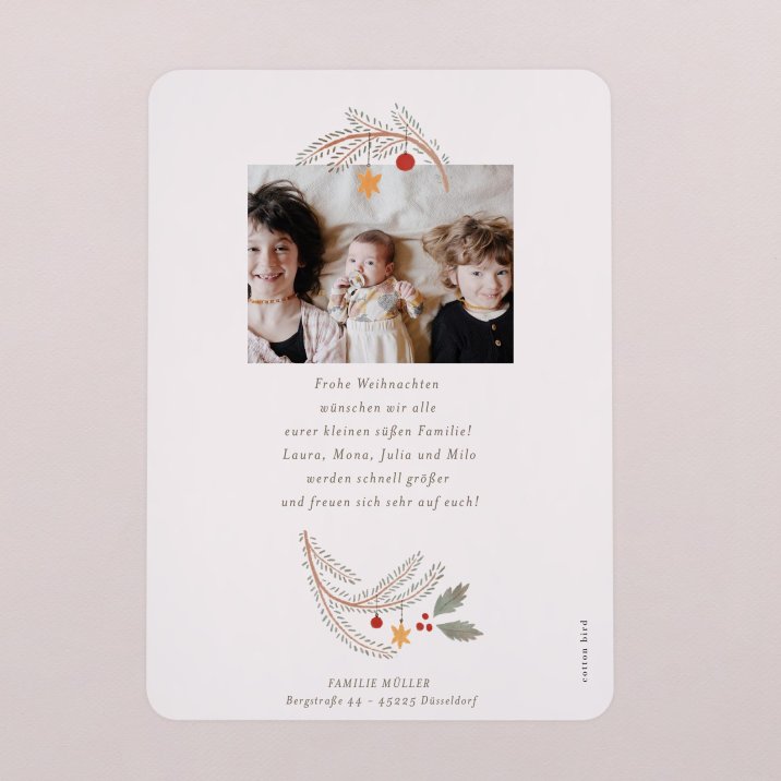 Weihnachtskarte im Hochformat mit abgerundeten Ecken. Beidseitig personalisierbar. Entdecken Sie auch die passenden Aufkleber und Umschlag-Einlagen!
