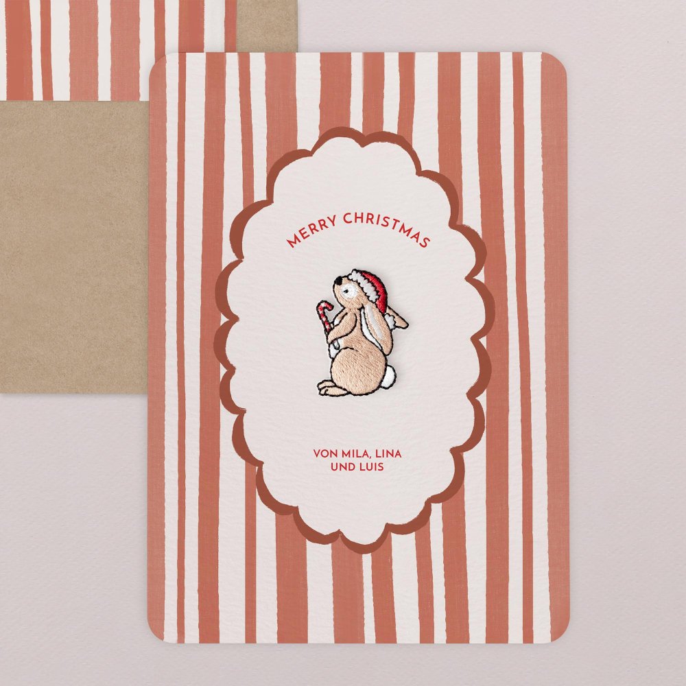 Die Grußkarte Christmas cherry sieht mit ihrem weihnachtlichen Streifendesign in saisonalen Farben und dem kleinen Aufnäher in der Mitte aus wie ein Geschenk aus Papier. Ihre Liebsten werden sich über diese liebevolle Aufmerksamkeit im Briefkasten freuen!