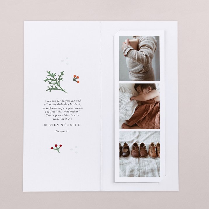 Diese Weihnachtskarte besteht aus einer hochformatigen Klappkarte und einem herausnehmbaren Fotostreifen, der als Andenken aufbewahrt, an den Kühlschrank gepinnt oder als Lesezeichen benutzt werden kann.