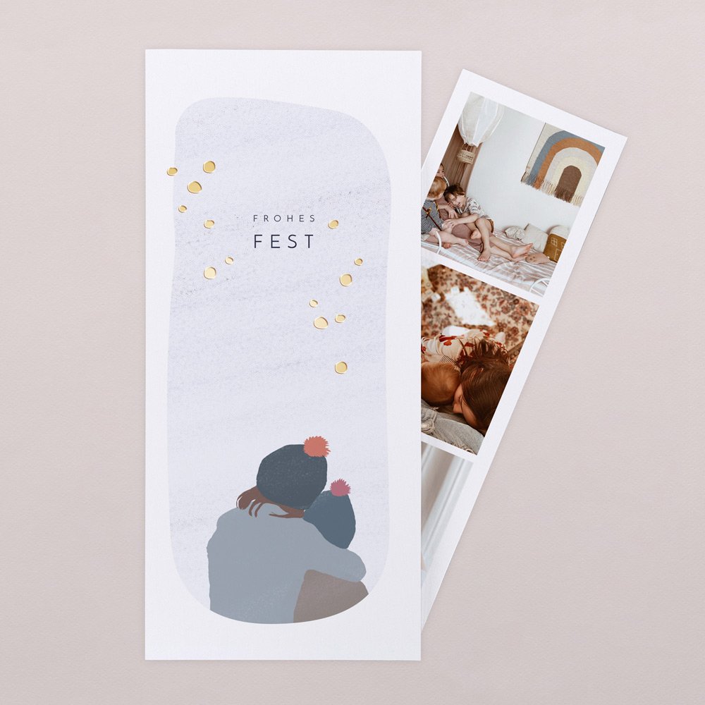 Diese Weihnachtskarte besteht aus einer hochformatigen Klappkarte und einem herausnehmbaren Fotostreifen, der als Andenken aufbewahrt, an den Kühlschrank gepinnt oder als Lesezeichen benutzt werden kann.