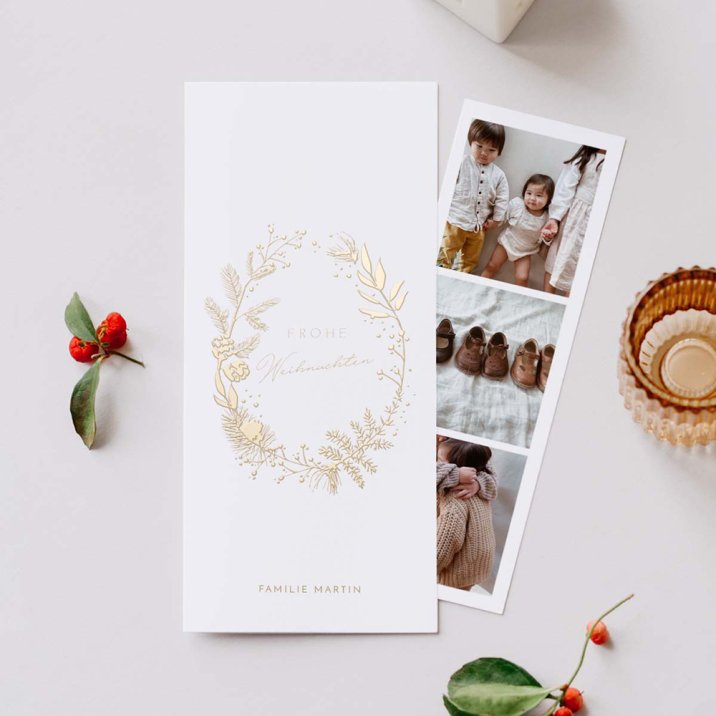 Diese Weihnachtskarte besteht aus einer hochformatigen Klappkarte und einem herausnehmbaren Fotostreifen, der als Andenken aufbewahrt, an den Kühlschrank gepinnt oder als Lesezeichen benutzt werden kann.