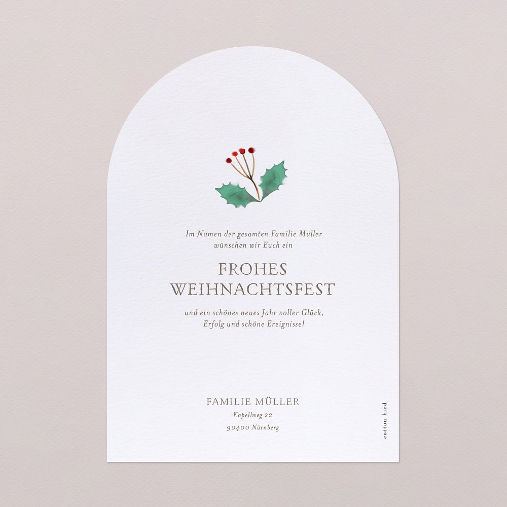 Diese elegante Weihnachtskarte mit bogenförmiger Oberkante kann auf der Vorder- und Rückseite personalisiert werden.