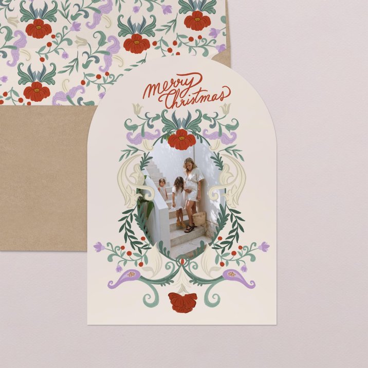Diese elegante Weihnachtskarte mit bogenförmiger Oberkante kann auf der Vorder- und Rückseite personalisiert werden.