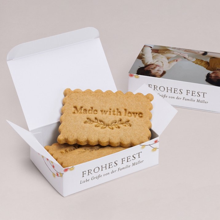 Personalisierbare Keksbox, die Sie mit Ihren Lieblingskeksen, Weihnachtsplätzchen oder anderen kleinen Leckereien füllen können. Die auf den Bildern abgebildeten Keksen sind nicht im Lieferumfang enthalten.