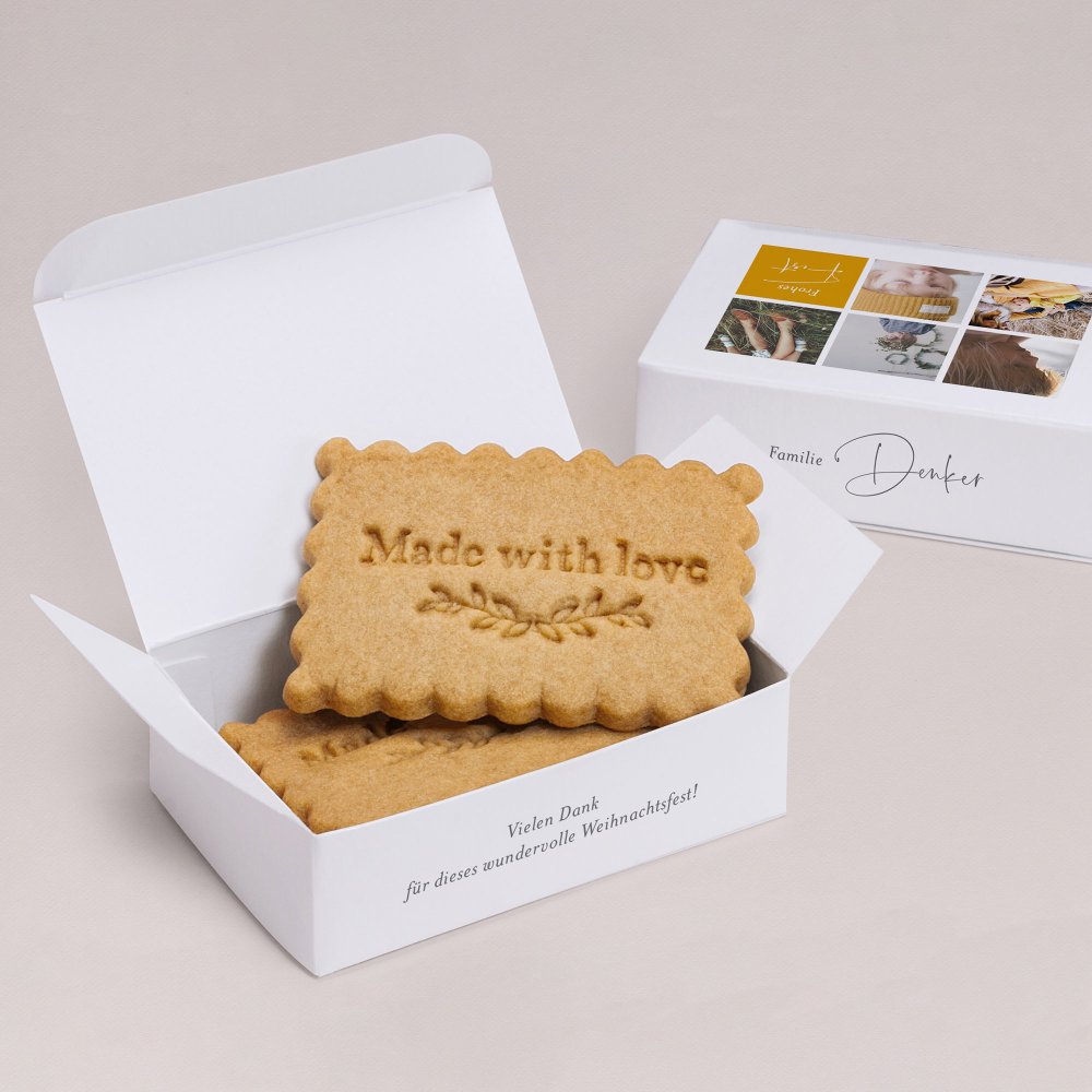 Personalisierbare Keksbox, die Sie mit Ihren Lieblingskeksen, Weihnachtsplätzchen oder anderen kleinen Leckereien füllen können. Die auf den Bildern abgebildeten Keksen sind nicht im Lieferumfang enthalten.