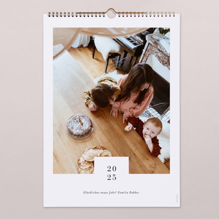 Für eine besonders edle Präsentation haben wir auf ein klares, modernes Design gesetzt – ergänzt durch eine sanfte Farbpalette, die Ihre Bilder zum Strahlen bringt. Eine hochwertige Spiralbindung in elegantem Bronze inklusive Aufhängung sorgt dafür, dass Ihr Kalender überall perfekt zur Geltung kommt. Erhältlich in zwei beliebten Formaten (A4 und A3), fügt er sich harmonisch in jedes Zuhause ein.
